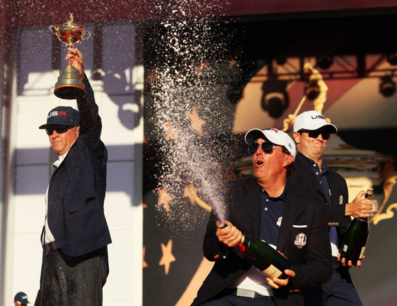 Then from the corner of his eye the Psychic notices a twitch from his sweat stained Ryder Cup cap. Instantly the view within the magic globe becomes a split screen. Half of the screen remains at the Masters, with its calm quiet respectful patrons. The other half becomes a sea of red, white and blue. The noise is deafening. The fans are a rowdy group of people who are cheering for Team Europe to miss a putt. Hit it into the water. Personal insults are shouted at team members on both teams. Then the Psychic sees a recent front page of the Star Tribune showing Ryder Cup hero, Phil Mickelson guzzling a magnum of winner’s champagne as thousands of drunken fans go wild.